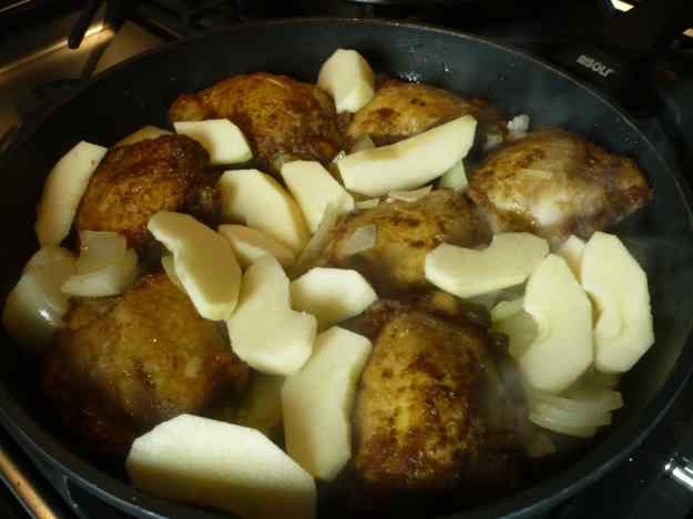 4. Peleu i talleu la ceba a trossos grans i afegiu , quan estigui mig cuita, la poma pelada i tallada a trossos.