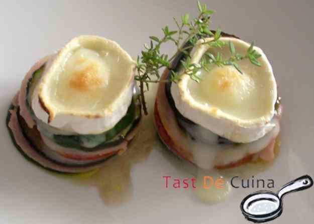 - Amb un motlle o bé el broc d’un vas tallarem a rodones el pernil dolç, fet això anirem posant capes de carabassó, albergínia, pernil dolç tomàquet, un altra de carabassó i un altra d’albergínia, acabant amb un tall una mica gruixut del formatge.