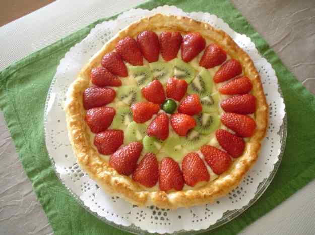 - Quan tenim la pasta fullada freda agafem la crema que tenim a la nevera I li posem per tota la tarta. Llavors hi posem la fruita que hagim escollit i li fem la decoració i forma que més ens agradi.
