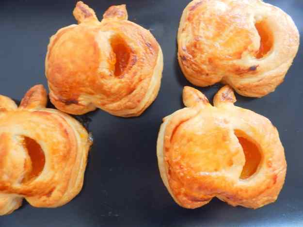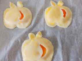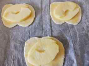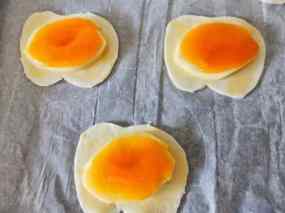 4. Talleu la poma a llesques primes i poseu-ne dues a cada tros a cada poma, poseu 1 cdta. de melmelada de préssec tapeu amb les 4 peces de pasta que queden. Amb la punta d’un ganivet dibuixeu una mitja lluna damunt i retalleu-la, de manera que quedi una obertura a la pasta.