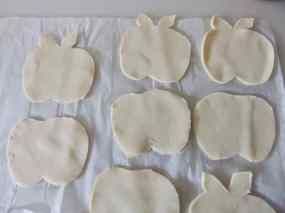 3. Poseu la plantilla damunt de la pasta i talleu 4 pomes amb les fulles i, 4 sense pinteu les que no tenen fulles amb el rovell d’ou barrejat amb la llet.