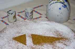 - – A continuació fem la base. Posem a escalfar les 6 tasses d’aigua en un cassó amb una mica de sal d’herves, quan bulli, abaixem el foc i hi anem tirant en forma de pluja la polenta, sense deixar de remenar amb una cullera de fusta un parell o tres de minuts, apaguem el foc i seguim remenant uns minuts més fins que veiguem que la polenta ha absorvit tota l’aigua i queda com una pasta.