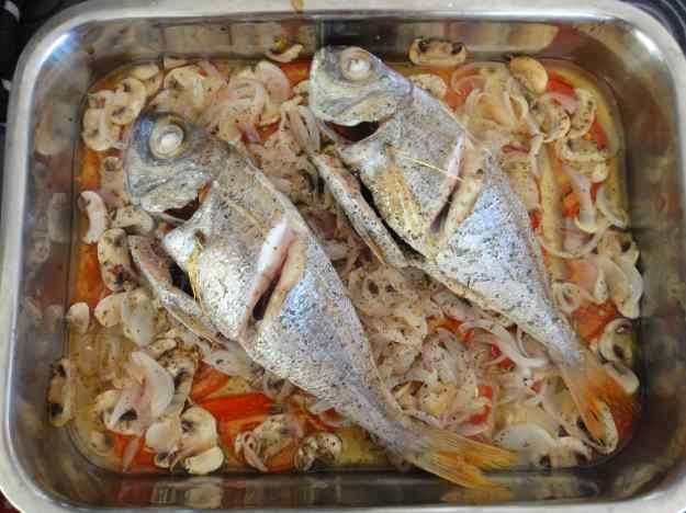 Posem en una safat de les que van al forn dues cullerades soperes d´oli. Fem primer una capa amb la meitat de les cebes i tot seguit una amb les patates tallades a rondanxes molt fines. A sobre de les patates posem la meitat dels tomàquets (pelats) i tallats a trocets i després la meitat dels pebrots, tallts finets. A continuació el peix, desespinat, cobrint-lo amb all i julivert. Ho acabem amb la meitat de les cebes, tomàquets i pebrots que ens quedaven. Hi tirem quatre cullerades soperes d´oli i el pebrot vermell dissolt en l´aigua.