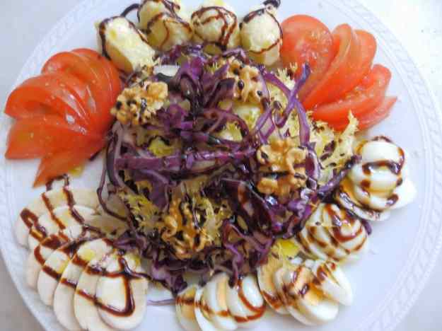 - Feu boles de brandada ajudades de dues culleres petites poseu a cada plat, l’escarola i la col llombarda al mig, les nous al damunt; al costat, els ous i la tomata a llesques fines, les boles de brandada i els xampinyons laminats.
