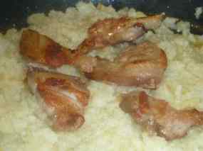 La cosa és ben senzilla. Sofregir en primer lloc els trossos de pollastre i tot seguit la cansalada virada (jo no en tenia…), una vegada s´ha retirat i reservat el pollastre. Jo ja he dit que no tenia cansalada, així que vaig decidir rostir una miqueta les cebes, que no eren exactament les de la recepta perquè vaig averiguar que no era temporada. En vaig comprar però unes de petites que ja feien el fet. A la recepta original les cebes no es couen amb el pollastre, sinó que ho fan amb aigua i mantega en un cassó apart. Jo vaig pensar que quedarien millor amb el pollastre i els tomàquets tallats a quarts…malgrat que a la recepta original et diu de posar-los sencers (sense pell). Total, que es posa a coure tot junt, vi i brou inclosos, amb les herbes aromàtiques durant uns tres quarts d´hora i et queda un pollastre boníssim!