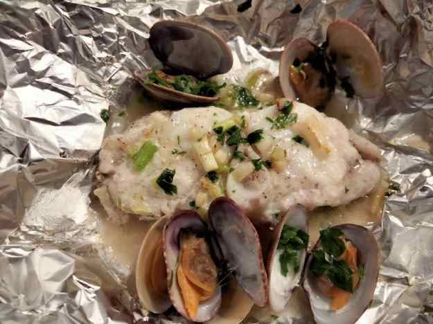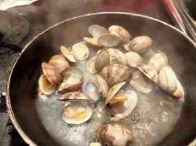 - Ara és el moment de afegir el fumet, mireu les indicacions del paquet d’arròs per mesurar el fumet per le quantitat d’arròs que fareu servir, poseu una tassa més, doncs ara, ho farem bullir uns 10 minuts per barrejar sabors , mentres obriu els muslus, en ena cassola a part, al vapor i les cloïses per a comprovar que no tinguin sorra. Ara ja podeu tirar l’arros, comproveu la sal,i 3 o 4 minuts abans de que estigui afegiu les gambes, els escamarlans, els musclus i les cloises.