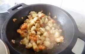 - Afegir oli, i les cebes i els anys tallats ben petits. Deixar a foc molt suau per que confitin una mica.