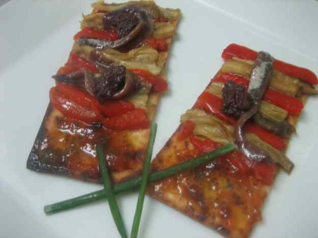 - Poseu una capa ben fina de confitura de tomàquet sobre cada coqueta i afegiu-hi l’escalivada deixant dos dits de marge en un extrem. Poseu les anxoves sobre l’escalivada i decoreu amb una culleradeta d’olivada. A l’extrem que heu deixat poseu-hi una cullerada més generosa de confitura de tomàquet i regueu-ho amb l’oli d’alfàbrega.