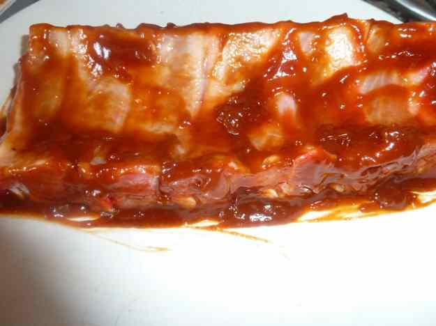 6. Per fer això treure la safata i les graelles a la vegada, per que l’adob que sobri caigui en la safata (no ruixar durant els darrers 10 minuts de cuina), fins que les costelles estiguin tendres y torrades(un 1 3/4 hora). Tirar l’adob que no utilitzat.Deixar reposar 5 minuts.