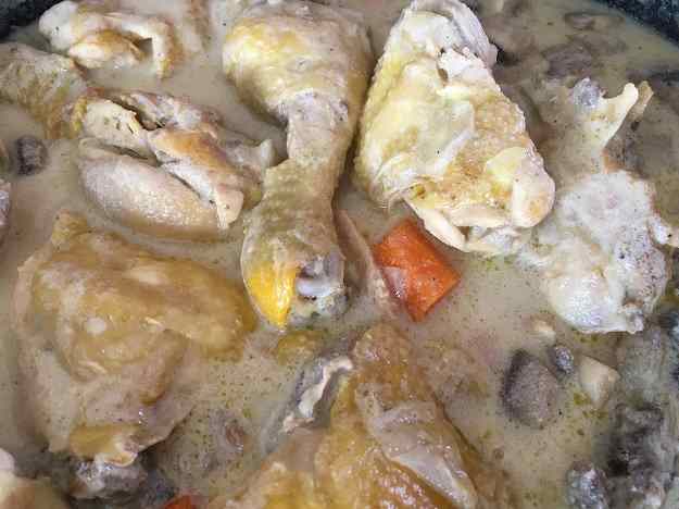 Un cop cuit el pollastre en reservem els trossos i portem a ebullició tot el liquid que quedi de la cocció. Reduim ben bé a la meitat del que tenim. En un cassó fora del foc barregem els rovells amb la crema de llet i, cullerada a cullerada, mentre anem batent, el brou reduit. Una vegada ho tenim tot integrat ho posem al foc fins que bulli. Un minut i retirem, afegint-hi un xic de suc de limona, una mica de nou moscada i, si fa falta, sal i pebre. Posem els trossos de pollastre a la cassola, ho cobrim amb la salsa i si ja estem llestos per dinar ho servim. En cas que ho haguem preparat abans ho reservarem tal qual, sense tapar, amb una mica de brou per sobre i ho escalfarem abans de servir-ho, ja amb els xampinyons i les cebes a dins. Jo, com que no tenia cebetes, hi vaig posar la ceba i la pastanaga que havia utilitzat al principi…que no es gaire acadèmic però li va donar un extra que no va estar de més. Una gran recepta.