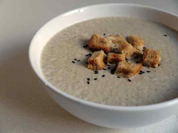 - Piquem les cebes, els alls, la pastanaga i el pebrot, tot ben petit. Preparem un sofregit amb la ceba i els alls, quan la ceba es comenci a daurar afegirem el pebrot i la pastanaga, passats un parell de minuts tirarem el cava, i deixarem que es vagi fent el sofregit. Quan el tinguem fet afegirem l’aigua, la crema de xampinyons, el curri. Deixem coure tot uns 15 minuts aproximadament, remenant de tant en tant, per evitar que s’enganxi. Rectificarem de sal si fa falta. Quan la salsa estigui la passarem pel turmix, perquè ens quedi fina.