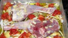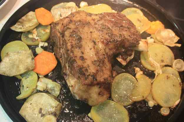 El brassejat, en aquest cas “blanc”, es posar la carn i les verdures, amb el brou, tot en una safata per anar al forn a la vegada, i coure-ho tapat amb paper d´alumini. Això és el que farem. Poseu un parell de fulles de llorer, una branca de romaní, una altra de farigola, unes quantes fulles de sàlvia, un bon manat de julivert i un altre de cilantre, 100 ml de vi blanc, un bon raig d´oli d´oliva, sal i pebre i finalment el brou de xai, amb mig litre segurament en tindreu prou, però mai està de res tenir-ne una mica més per si us quedeu sense brou. Enfornem a 180 graus durant unes dues hores, donant-li voltes a la cuixa de tan en quan.