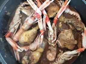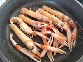 - En una cassola on fareu l’arrós hi poseu un bon raig d’oli i feu freigir volta i volta les gambes i els escamarlans, ja salats , només que cambiïn de color, retireu i reserveu.