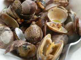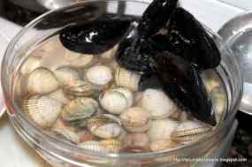 - Les cloïsses i les escopinyes les posen en un bol amb un grapat de sal i aigua, y deixarem 1 hora mes o menys perquè treguin la possible terra que poden tenir.