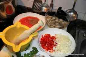 - Trinxem les cebes, tallem els alls a lamines, ratllem els tomàquets i el pebrot vermell a trossets.