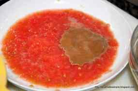 - Una vegada que la ceba esta ben caramel·litzada amb una tonalitat fosca, afegim el pimentó vermell i seguidament el tomàquet ratllat. Afegim el raig de vi Porto, la salsa de la sèpia, remenem i deixem fer uns 20 minuts. Ha de quedar com una melmelada.