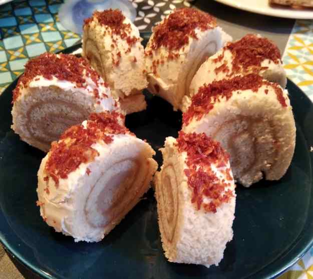 - Untem amb fua el pa i el cargolem amb forma de rotllet. Tallem el rotllet amb un gruix de dos dits. Reservem.