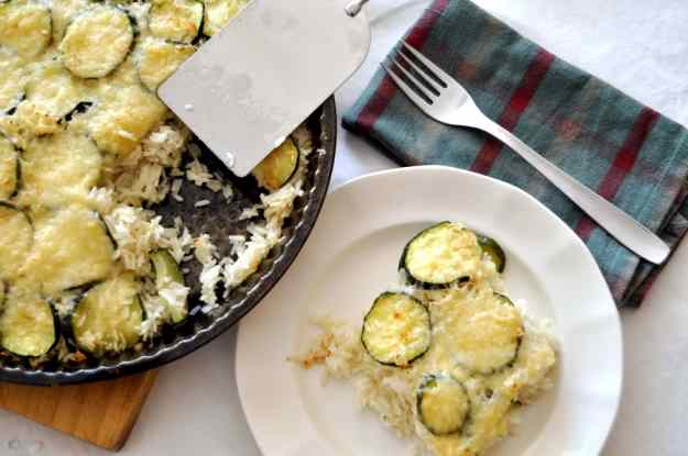 4. Untem un motlle amb una mica d’oli i hi tirem l’arròs i els carbassons. Intenteu qu el carbassó quedi a la part de dalt. Espolvoregem el formatge i ho posem al forn a 180 º durant uns 20 minuts perquè es cogui tot. Després, gratinem uns 5 minuts perquè el formatge quedi daurat. L’arròs quedarà amb una textura molt cruixent.