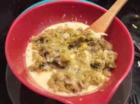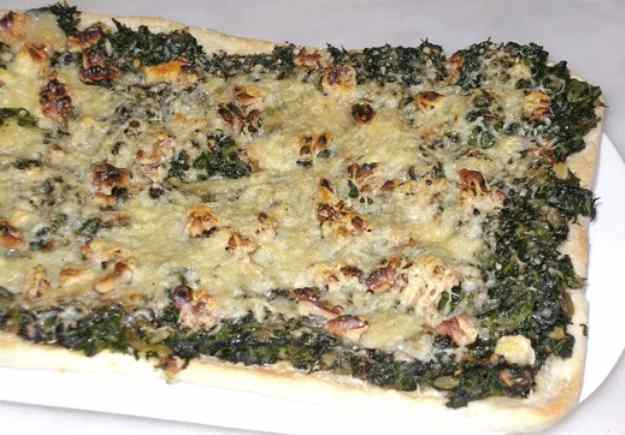 - Hi posem una mica de sal i deixem daurar i reduir. Hi posem els espinacs frescos (i si no n’hi ha, doncs de congelats) i els poso a la paella amb oli, pimentó vermell i sal. Els deixem reduir junt amb la ceba. Un cop cuits, treurem la plata el forn on la pasta s’haurà fet ja una mica i li posem els espinacs per sobre.