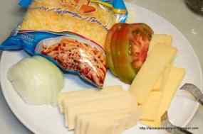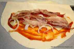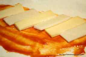 - Cobriu-la totalment amb una capa de llesques de pit de gall d’indi i per sobre una capa de de llesques de formatge.