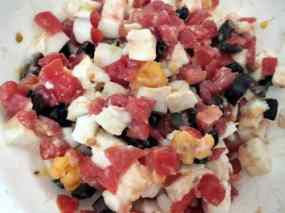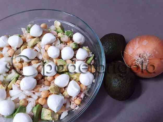 - En un bol posem els cigrons cuits i escorreguts, la ceba tallada petita, la tonyina també escorreguda i els alvocats també a trossos, ho amanim bé amb la vinagreta, ho remenem bé i hi posem la mottzarella per sobre.