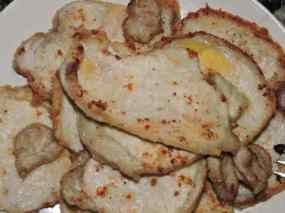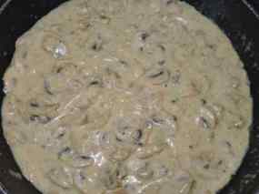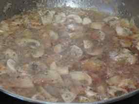 - Prepararem ara els xampinyons. Els fem ben nets, sense gens de terra. Els tallem el peu a rodanxes primes i la resta en quatre quarts. En una paella antiadherent, posem els xampinyons a fregir. Quan hagen amollat l’aigua que trauen, els la llevem i continuem fregint fins que estiguen cuits però no gomosos.