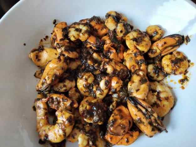 - Paral.lelament saltegem les gambes amb una mica d´all i quan estiguin cuites les posarem a la paella on hem preparat la chermoula juntament amb els musclos.