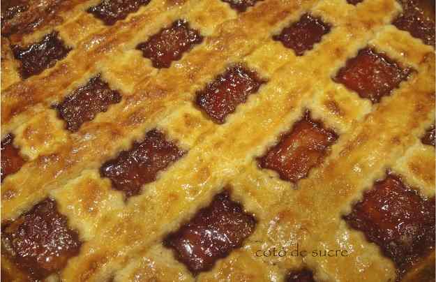 Es bat la mantega amb el sucre, s’hi afegeix l’ou, l’aiguardent, les espècies, l’ametlla i la farina fins que queda una pasta llisa. La deixem a la nevera almenys 1 hora. En separem 1/3. Estirem els altres 2/3 amb el corró damunt d’un paper parafinat i enfarinat, ja que és una pasta que quan perd la fredor s’enganxa una mica, i la col·loquem dins d’un motlle rodó de paret baixa i desmuntable, untat amb mantega. Hi posem una capa de gelea de grosella o melmelada. Estirem l’altre terç de pasta i en tallem unes tires llargues, de 2 cm d’ample, amb un tallador com de pizza però arrissat, i les posem per damunt formant un enreixat. La pintem amb el rovell d’ou. L’entrem al forn, ja calent a 170º, uns 25 minuts.
