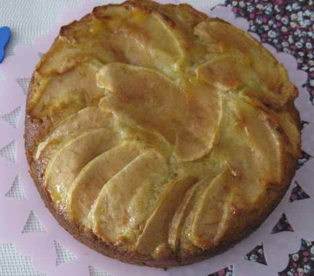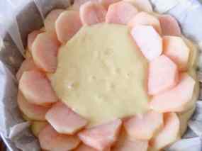 8. Pelem i talem la poma per la mitad i la tallem a làmines ben fines i la posem amb compte per sobre la massa que tenim al motllo.