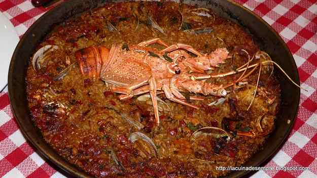 - En una cassola de fang, amplia i fonda, poseu oli i sofregiu el calamar i la sèpia (es pot fer sense aquests ingredients) i afegiu les cebes, els alls i tots els altres components. La cocció es farà amb foc lent i s’anirà refegint el fumet de peix que prepararem abans.