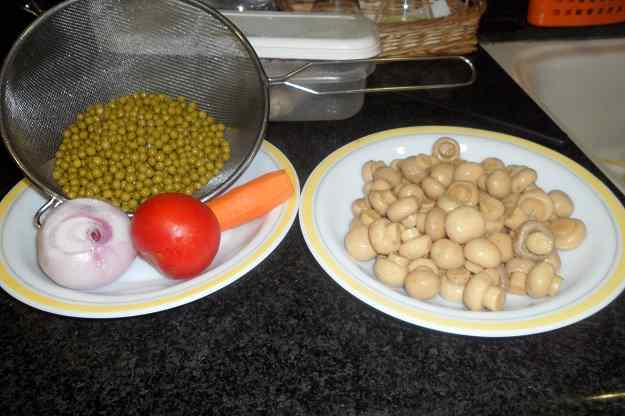 - Es fileteja l’all i es daura amb una mica d’oli a un caçó, desprès s’afegeixen els pèsols i el brou, es deixa bullir fins que els pèsols siguin tous.