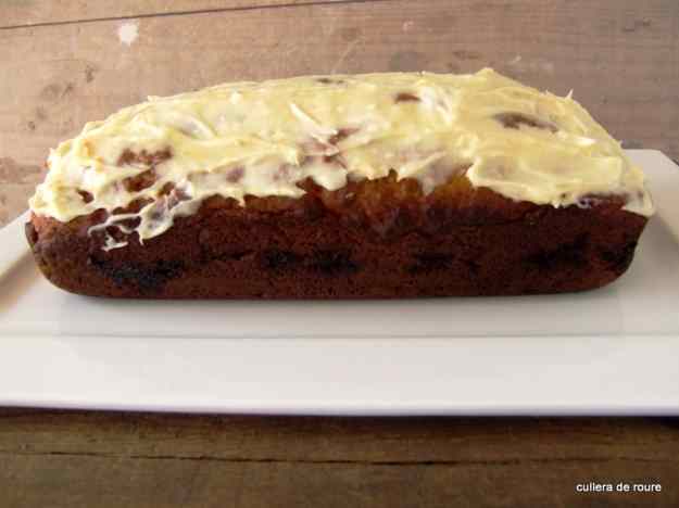 5. Quan estigui barrejat, poseu en un motlle de plum- cake, la meitat de la massa, llavors hi exteneu el farciment, amb un ganivet feu un zig-zag, cobriu-ho amb la massa restant.