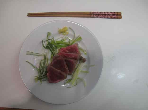 - Per a decorar el plat, tallarem en juliana la ceba tendra i ratllarem el gingebre. I aquí ho tenim ja muntat: