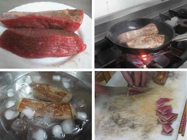 - La saltejarem amb oli a foc fort per que es torri l’exterior. Quan estigui torrada, la posarem en un bol amb aigua i gel per aturar la cocció. Es deixa refredar i es talla a làmines fines amb un ganivet.