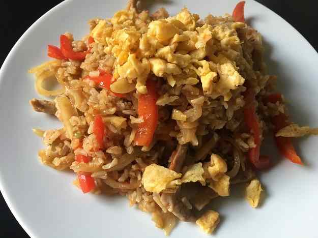 Tallem la carn a tires. La ceba també, l´all ben picat, els pebrots també a tires i als tomàquets els hi treieu la pell i les llavors, i després els talleu a tires. Saltegeu la ceba i l´all, el pebrot i els tomàquets. Ho reserveu. Feu el mateix amb la carn i la reserveu. Saltegeu l´arròs, que ja l´heu de tenir fet, i ho junteu tot al wok. En un cassó petit poseu la salsa de peix, el sucre, la ketjap manis i el pebre fins que el sucre es disolgui, i ho afegiu al wok. Barregeu bé, bateu l´ou i l´incorporeu al plat, en un plis es coagularà, i llestos. O també podeu fer una truita ben fineta i tallar-la a trossets, com vaig fer jo.