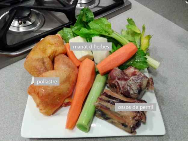 2. En una olla grossa es posa l’aigua a bullir i s’afageixen totes les verdures i els ossos de vedella rostits.