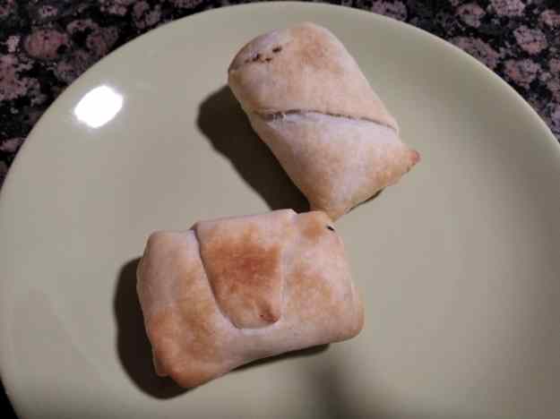 - Dividiu la massa en 3 trossos, s’aplana una mica i es deixen com rectangles. Al mig de cada un hi poseu la crema d’ametlles o el massapà o tot junt, ho doblegueu deixant tapat el nou farcit, posant-ho en llaunes o recipients individuals per anar al forn. O com jo, sobre la mateixa plàtera de forn, on us quedarà més ample de forma.