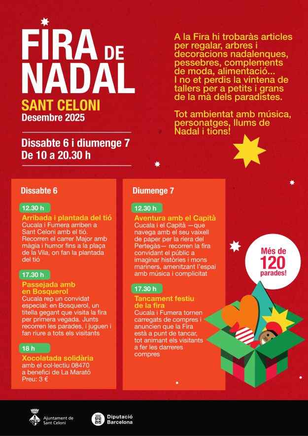 La Fira de Nadal enguany comptarà amb més de 120 parades amb articles per regalar, arbres i decoracions nadalenques, pessebres, complements de moda, alimentació… També es portaran a terme una vintena de tallers per a petits i grans de la mà dels paradistes.