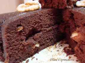 4. Passem la farina per un cedàs i afegim la canyella i el llevat. Baixem la velocitat de la batedora i afegim gradualment la farina i l’oli. Trenquem les nous a bocins petits i les afegim a la massa amb els grills de poma cuits.