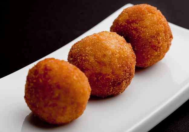 4. Muntatge: s’agafa mitja cullerada d’arròs i es posa al palmell de la mà aplanant una mica amb la cullera, s’hi posa una culleradeta de salsa de tomaca, un quadradet de mozzarella i una altra mitja cullerada d’arròs. Amb les mans s’acaba de donar-los forma rodona. Es passa per farina, ou batut i farina de galeta. Va bé deixar-los a la nevera una hora.