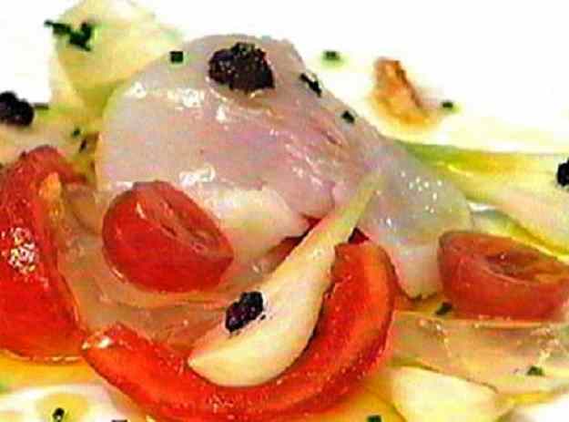 Quan quedi poca estona per a dinar/sopar tallem a quadradets ben petits el pebrot vermell, el barregem amb el tomàquet, l´olivada, l´oli d´oliva, les anxoves picades, l´escalunya i el pebre. Treiem el bacallà del congelador i amb l´ajuda d´un ganivet que talli molt (o d´una màquina de tallar fiambres, si es que en teniu…) anem fent talls com si fossin per a fer un carpaccio. Posem una cullerada del pebrot i el tomàquet amanits i ho tanquem com si fos un ravioli. O sigui, cal que la peça de bacallà sigui força gran. De totes maneres agafeu la idea i després munteu els raviolis com us vagi millor, i els serviu en un plat soper acompanyats d´una mica de gaspatxo. Una vegada els convidats (o qui sigui que dini/sopi amb vosaltres) ho hagin vist se´ls hi ofereix més gaspatxo!