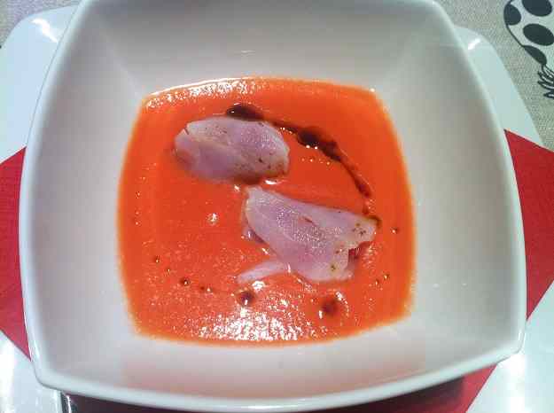 Primer de tot fem el gaspatxo, amb suficient temps perquè sigui ben fred al moment de menjar-lo, triturant tots els ingredients en una batedora (oli i vinagre al gust del consumidor, igual que la sal), ho passem pel colador xinès i ho reservem, tapat, a la nevera.