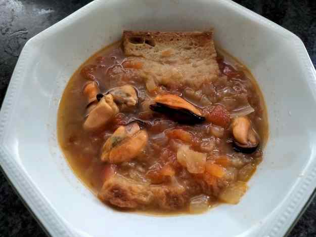 - Retireu les closques dels musclos i alguna de les rossellones. Reserveu el suc que han fet i coleu-lo amb un colador de tela; barregeu-lo amb el brou de peix.