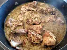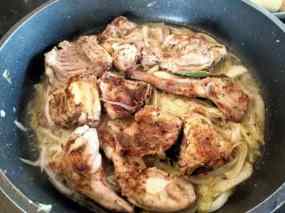 - En la mateixa cassola, si cal afegiu oli, fregiu els alls i les ametlles, tot picat afegiu el porro i la ceba, tallat a trossets desprès els pebrots a trossos i les pastanagues; deixeu coure a foc mitjà durant uns 10 minuts. Afegiu el vi i deixeu evaporar.