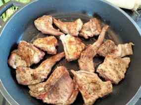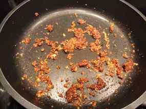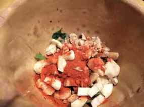 - En una cassola i amb tres cullerades d’oli, fregiu les anelles de calamar retireu-les i en el mateix oli, si cal n’afegiu, fregiu lleugerament, primer les cues de gamba pelades, (reserveu-ne una per cada plat, sense pelar) i desprès els rap tallat a daus reserveu fora de l’escalfor.
