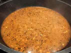 - Poseu el pebre vermell i el julivert picat i tot seguit la farina, remeneu perquè es cogui una mica i poseu el brou de peix; tapeu la cassola i coeu a foc baix durant 15 minuts, remenant de tant en tant.