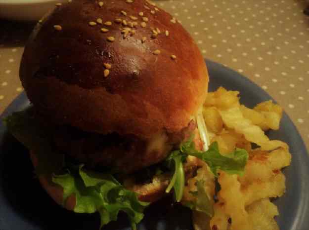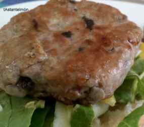 - Primer de tot, piquem la ceba ben petita i la “pochem”. Mentrestant, fem la pasta de l’hamburguesa: barregem la carn, una mica de sal, una punta de pebre, l’ou i la mostassa i mesclem bé. Hi afegim farina de galeta fins que quedi ben agafat. I ara la ceba ja una mica cuiteta, que es mescli bé amb la massa; i a fer 2 boles, que aixafarem i donarem forma d’hamburguesa.
