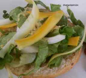 - Posem a escalfar la planxa i hi torrem una mica els panets perquè siguin més resistents al suc que pugui deixar la carn i les salses. Tot seguit, traiem els panets i ja tenim la planxa a punt per coure-hi la carn. Mentre es fan les hamburgueses, anem muntant el torpede d’entrepà; vosaltres mateixos: maionesa, una mica d’enciam, unes rodanxes de tomàquet, quètxup, més enciam… Mostassa no cal, que ja en tenim a la carn i queda molt aromàtica. Ah!, el cheddar poseu-lo damunt la carn un cop cuita perquè es fongui.