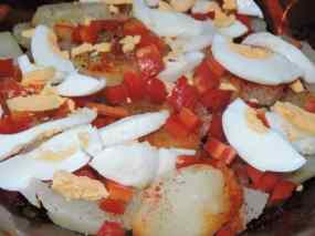 - En el mateix oli, sofregiu la ceba i el pebrot. Tapeu l’olla deixeu que s’estovin durant 10 minutets a foc mitjà.
