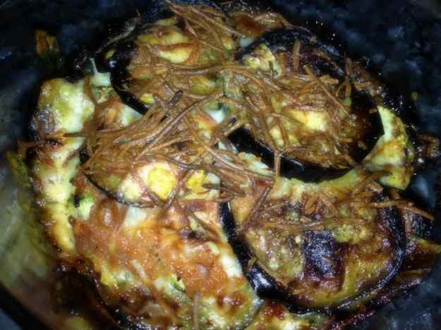 6. Posem un recipient per anar al forn i anem fent capes: albergínia, carbassó, tomàquet, i parmesà.